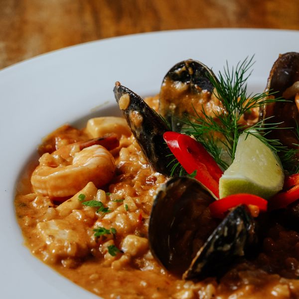 - Seafood Risotto w’ Prawns, Mussels, Local Fish & Calamari in a Creamy White Wine Prawn Bisque (GF)